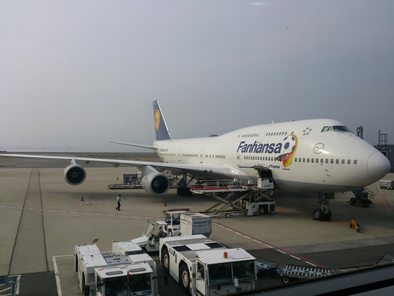 写真は帰国時に搭乗した飛行機(ルフトハンザLH740便)。2014年ブラジルワールドカップを記念した特別塗装機です。