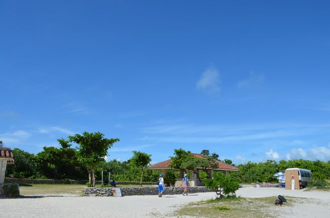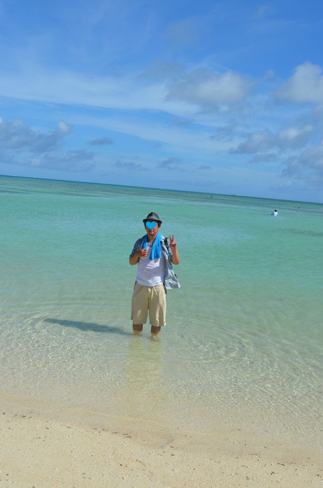 カイジ浜。レンタサイクルのおじさんは「一すくいしたら2〜3個は星砂が見つかる」と言っていたけど1粒も発見できず。早々にhikochanはお土産用の星砂を買いに行きました。