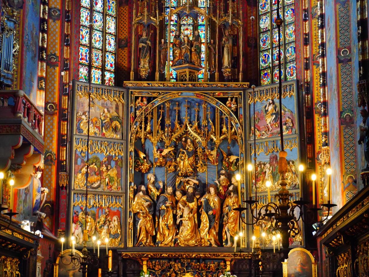 ステンドグラスと中央の祭壇にある絵のように思える木彫りの装飾品。目が点です。これ木彫りなの??当時の技術って本当にすごい。もしかして今でも作れるかもしれないけれど、500年前と今では使っている道具も全然違うでしょう?