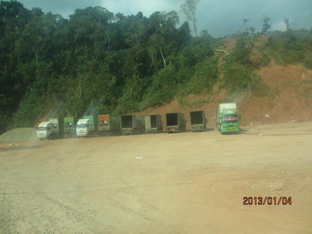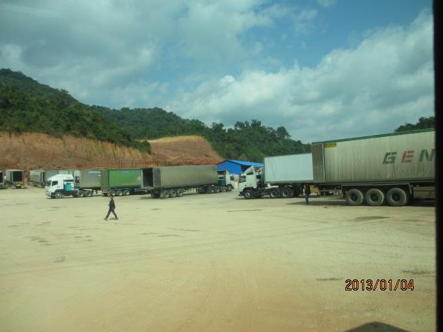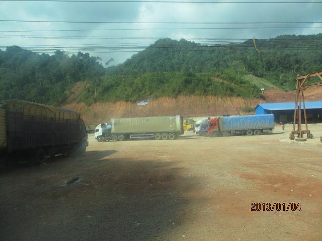 ラオス側国境には通過待ちのトラックが数多く時間待ちしている。