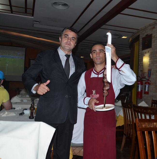 問題はレストランの課金システム。サラダバーは品数豊富で日本で想像するサラダバーとは全然違います。要はシュハスコ以外の食べ物(生野菜、スープ、ライス、魚料理、デザート等何でも揃っています)。これでうる覚えですが安い料金でした。シュハスコの食べ方というのは、色々な種類の焼いた肉の塊を持ったウェイターが各テーブルを回ります。気に入ったのがあれば切り分けて貰います。問題はこの一切れがいくらか私は分かりませんでした。結構な種類を食べ、豚足の塊まで食べました。友人と二人でアルゼンチンの赤ワインボトル、サラダーバー、それにシュハスコで、豪勢に楽しみました。それでも総額210レアル程。日本円で5000円位でした。美味しかった。