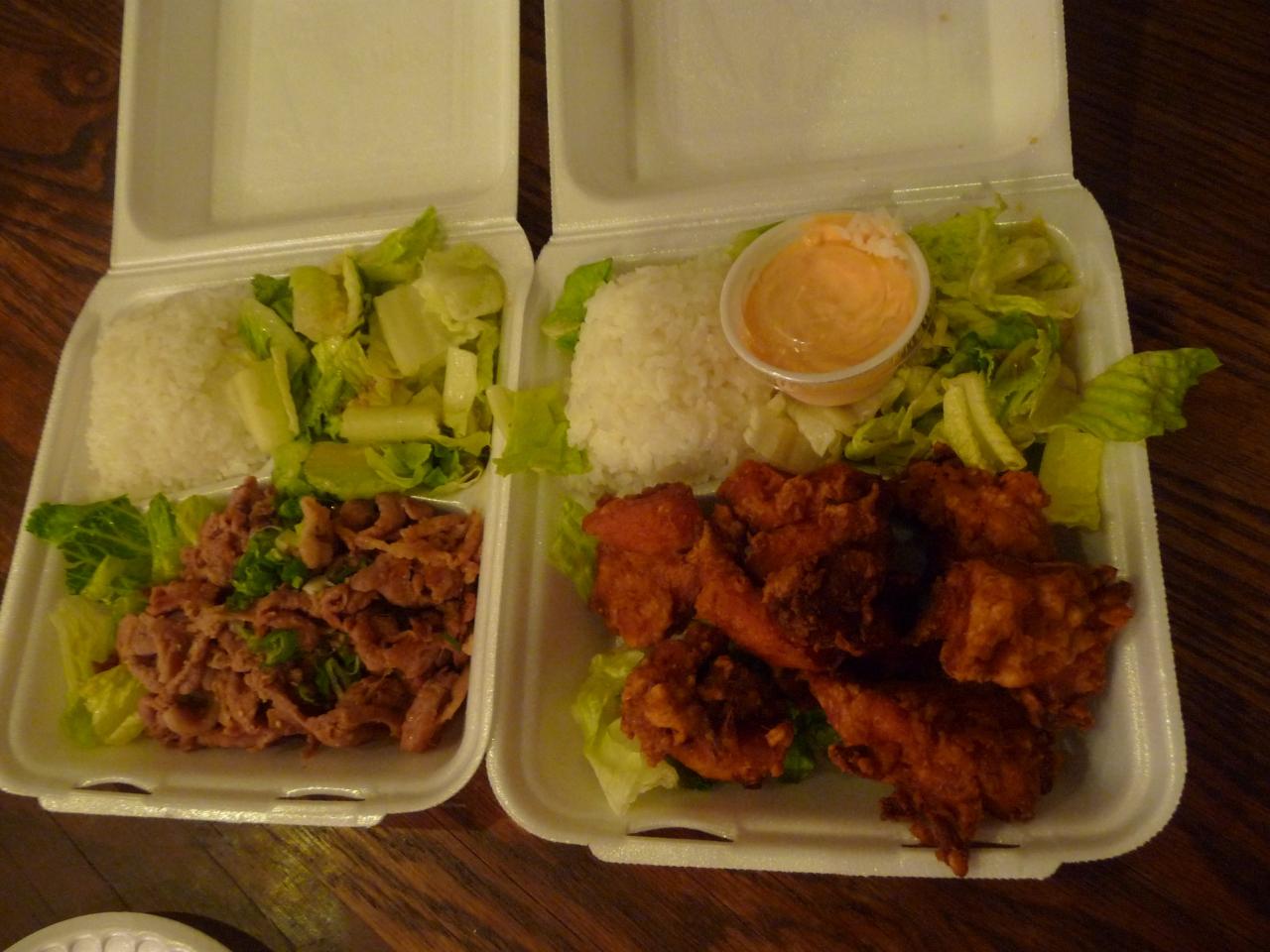 その日の夕食。ホテルから少し歩いた所にあるミー・バーベキューでプレートランチを買ってホテルの部屋で。