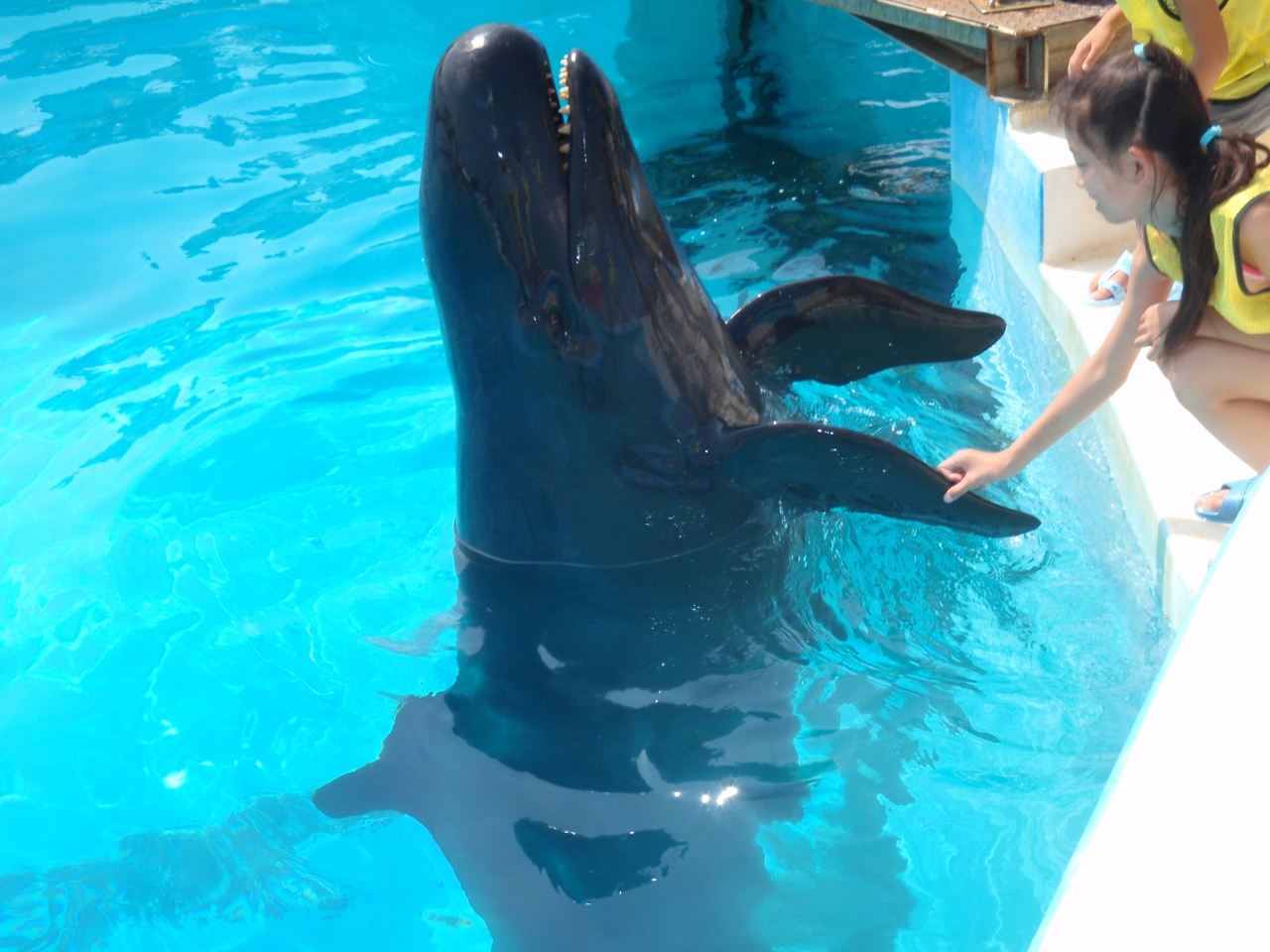 写真は、美ら海水族館オキゴンドウクジラと握手♪のマリア様。