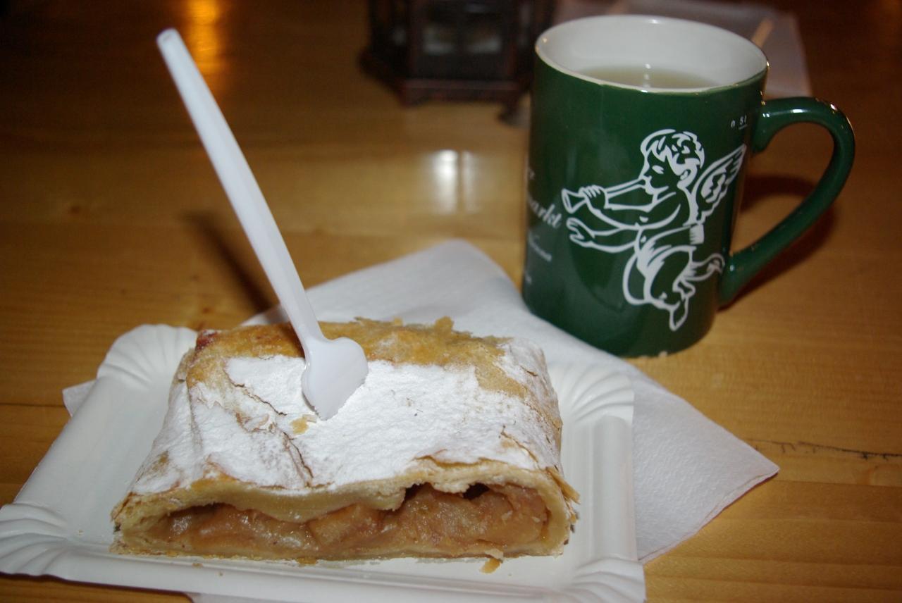 マーケットの中でいただいたアプフェルシュトゥルーデル(しっとりしたアップルパイのようなもの)とアプフェルプンシュ(ホットリンゴワイン)です。