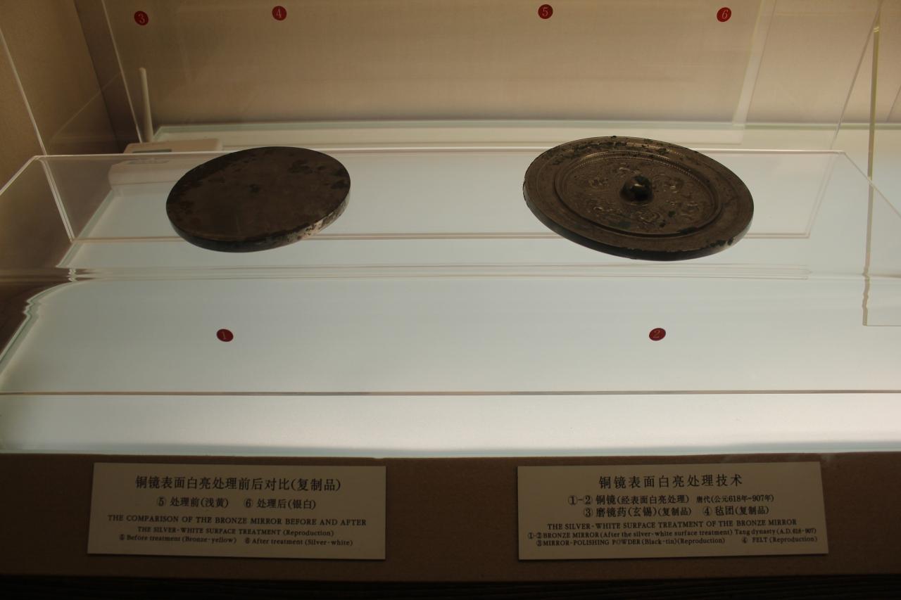 銅鏡。教科書で見るのは模様がついているほうばかりですが、鏡の面を見るとしっかり反射していることがわかります。