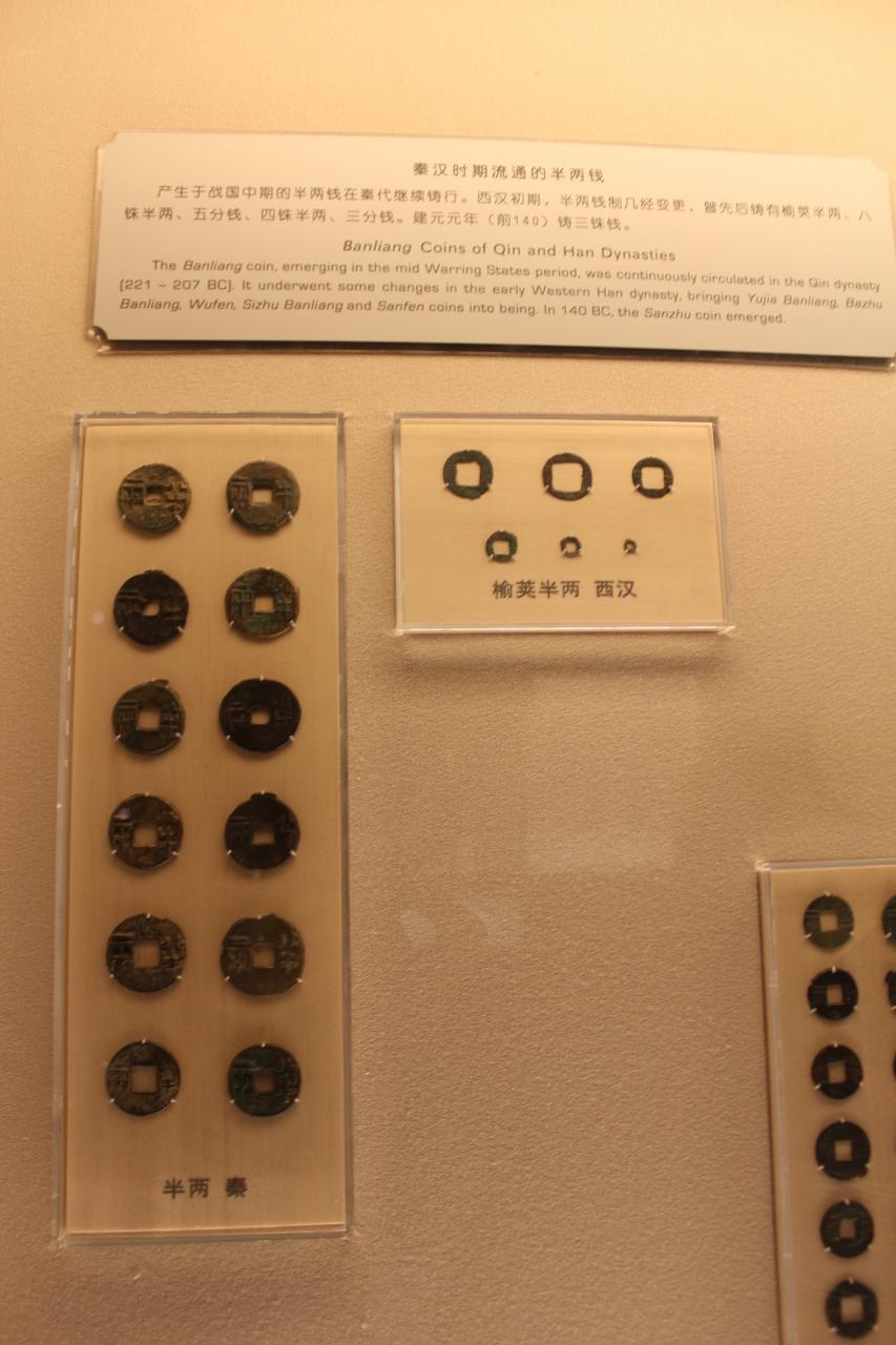 秦が作った半両銭です。戦国時代を統一したのが秦じゃなかったら円形じゃない別の形の貨幣が広まっていたのかな。