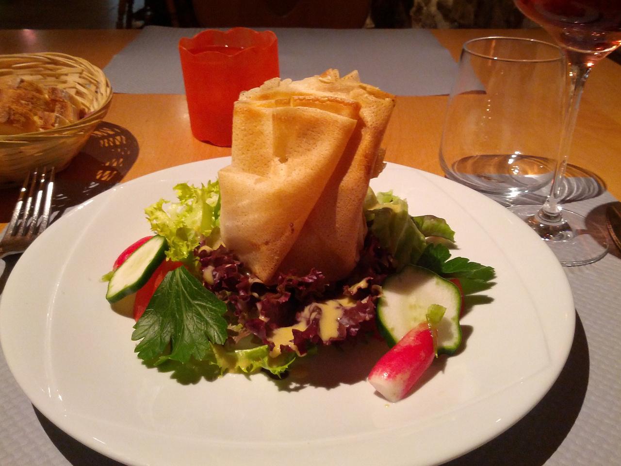じゃーん、前菜です!パリパリクレープ ムンステールチーズ入り。テュルクハイムからムンステールは近いはずです。アルザスチーズといえばそこです。 -