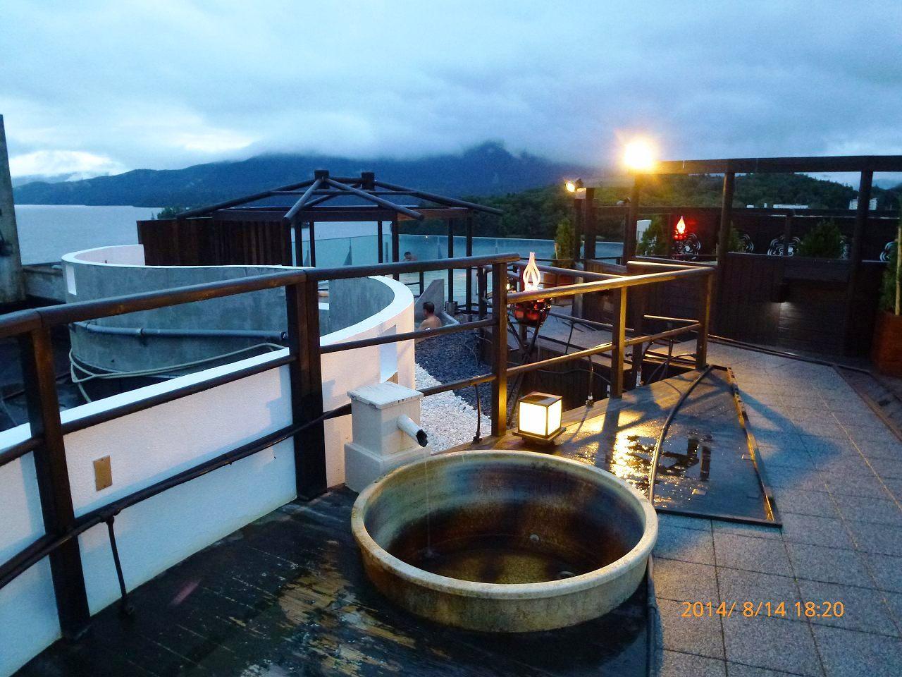 天気が雨で湖眺望がイマイチですが、広い露天風呂があります。