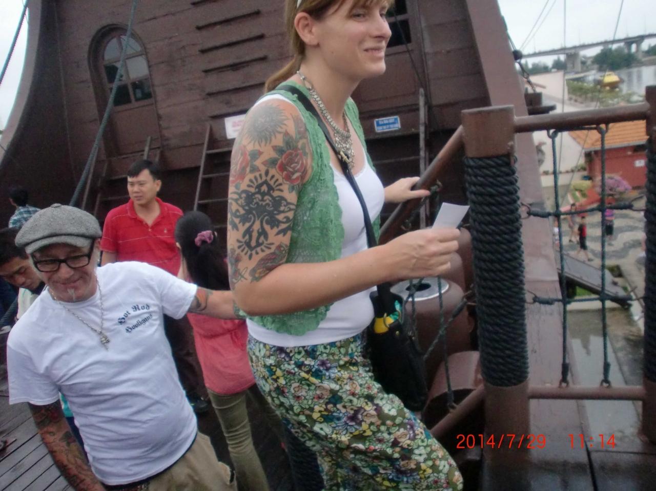 海洋博物館である木造船をバックに