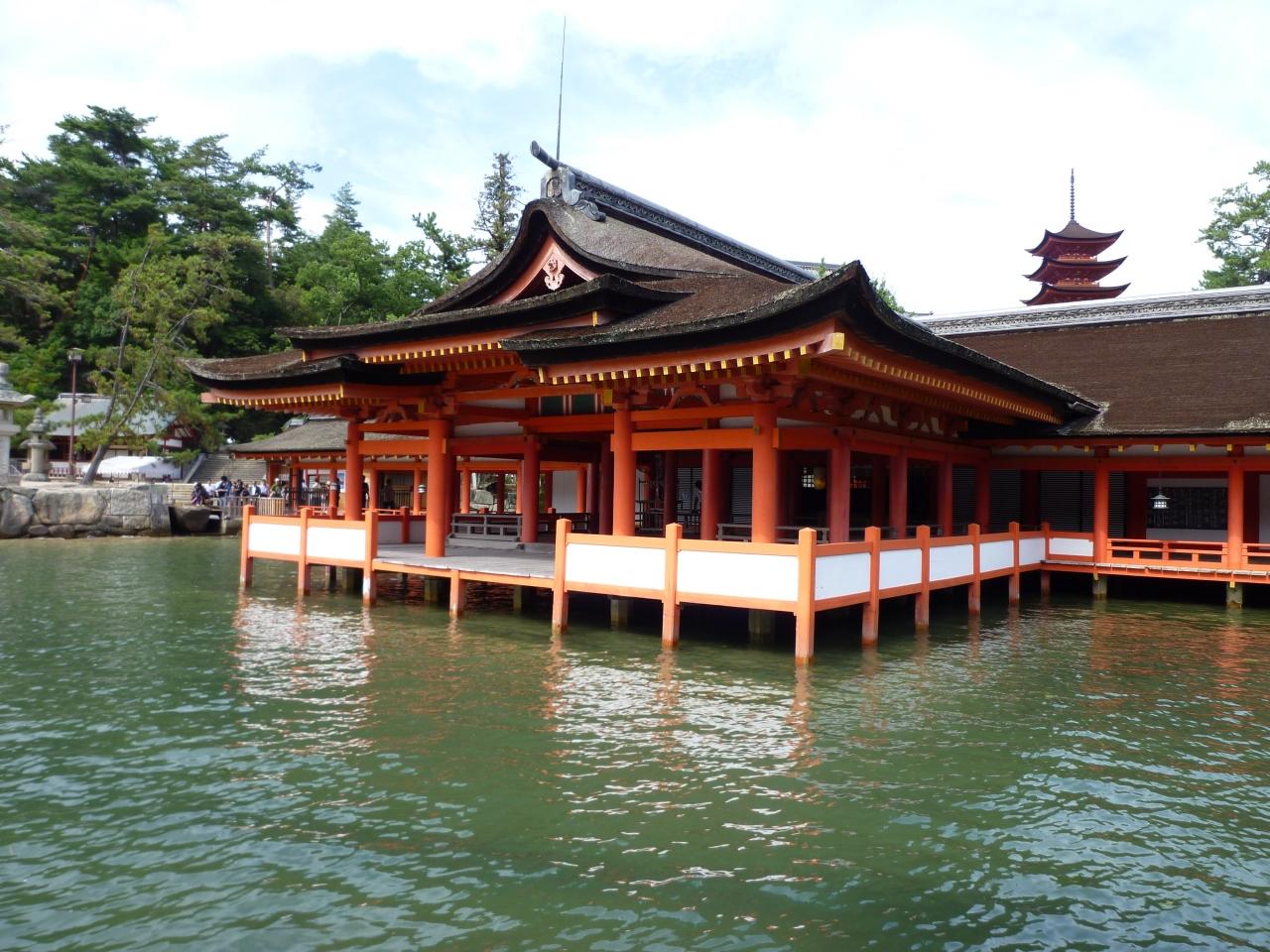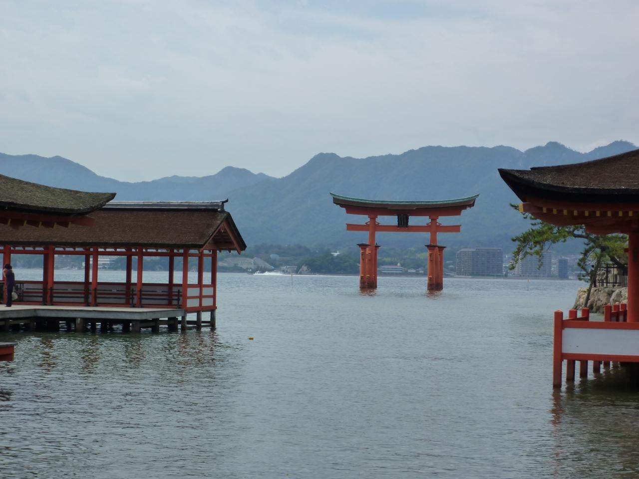 たどりついた厳島神社。ちょうど満ち潮時だったので、海に浮かんでいる様に見える大鳥居。 本殿も海の中で、能舞台もあり、物語の中にいるような気持ちになりました。