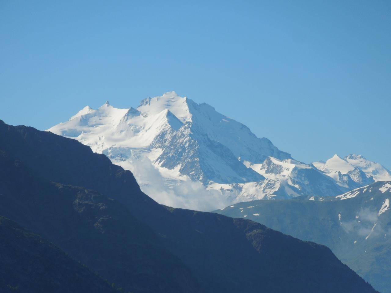 ワイスホルンとチナールロートホルンのズームアップ。今までヴァリス州南部で眺めた山々が、遠く離れたここから見えるのは大きな感激がある。