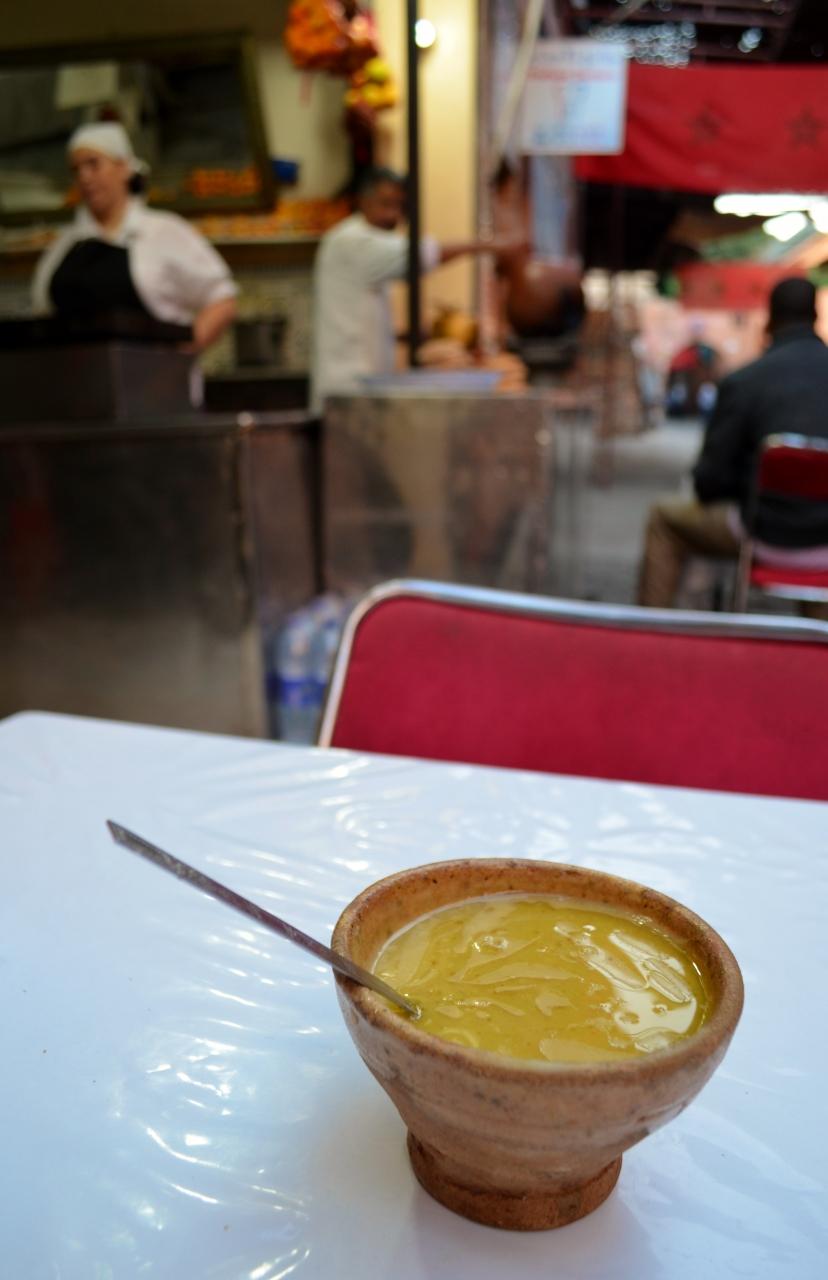 壺の中身は不思議なスープ。原材料は不明だが、豆のような味に豆や野菜をすりつぶしたザラザラ感が残る。そして何かの油が2mmほど膜を張っています。