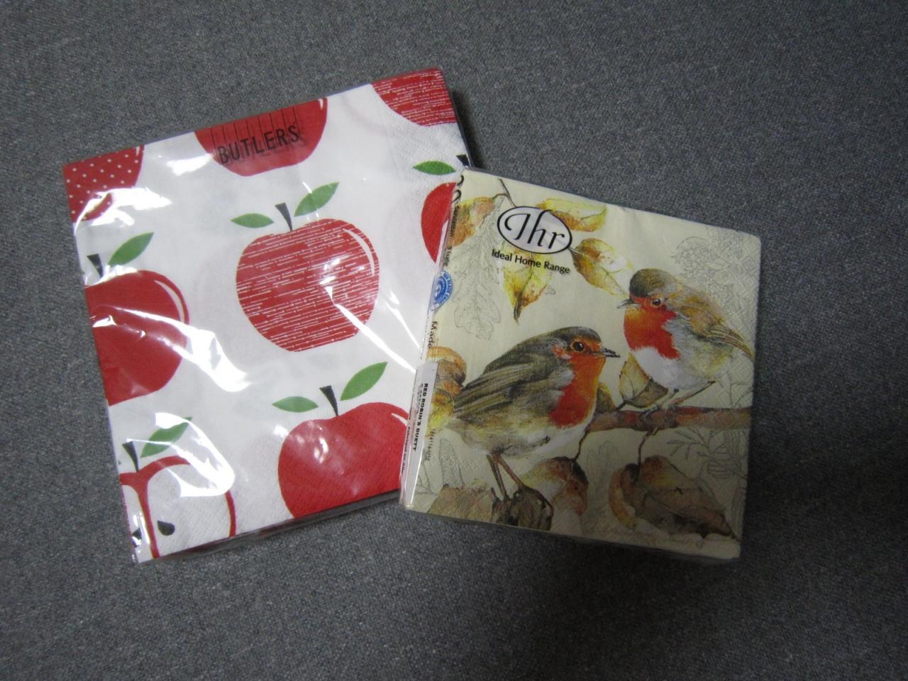 • ペーパーナプキン。<br />りんごのは雑貨屋バトラーの特売品。<br />鳥のはKaDeWeで買ったIhrのもの。<br />Ihrはステキな図柄を沢山出しているので、まとめ買いしようと思ったんだけど、今回の旅ではあまり見かけなかったんです、残念。