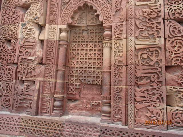 塔の周囲を一周する。周囲は約14m。そこには、芸術的なアラビア文字が彫られているが、それは経典コーランを模写したものと言う。クトブ帝存命中にはこの塔は完成せず、次の王の治世に完成した。この塔は並々ならぬ営為の結晶であった。