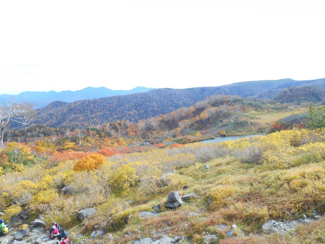 奥へ進み振り返ると緑岳の南尾根とエゾ沼と紅葉が見事なコラボ
