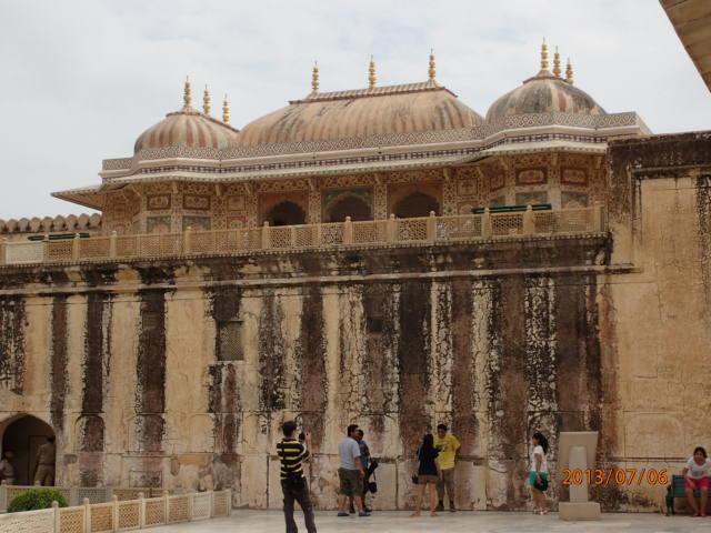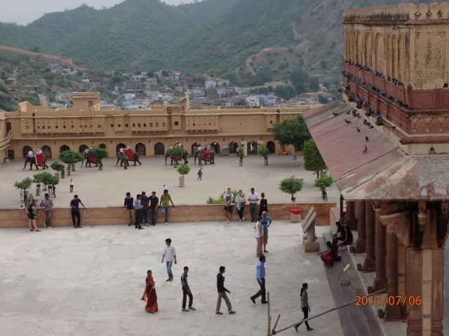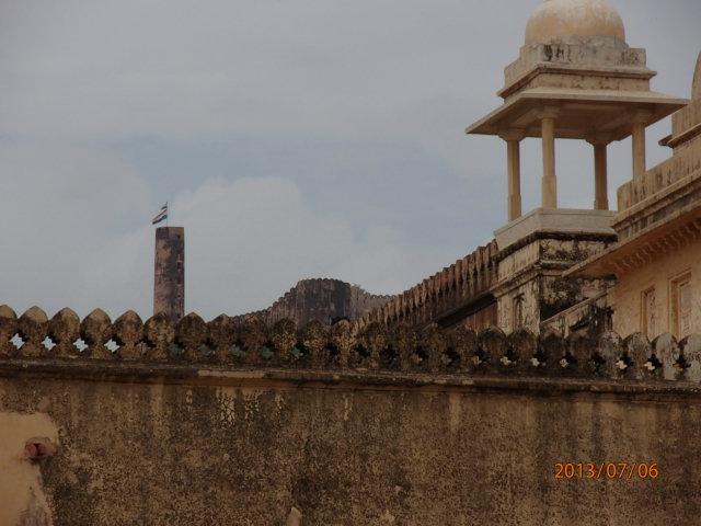 しかしここは山上にあるだけあって、見晴らしは良い。出窓の辺から下を見下ろすと、谷間の先にずっと広がって集落が見える。この集落の先にジャイプールがあるのだ。これだけ周りを山に囲まれ、しかもそれらのピークには、砦のような見張り台のような出城が作られている。この城自体が堅固な石造りで、しかも周りを出城に囲まれている。実に難攻不落であったに違いない。