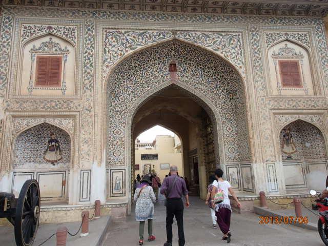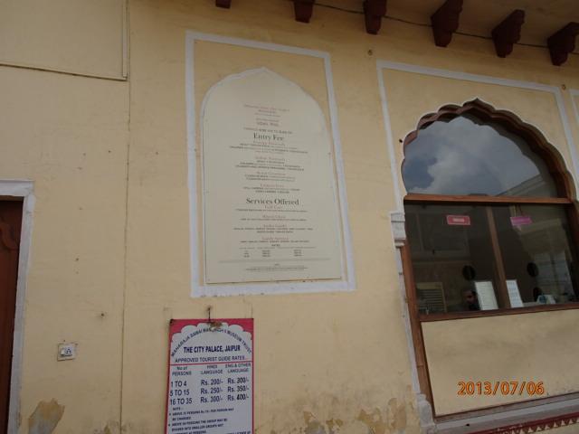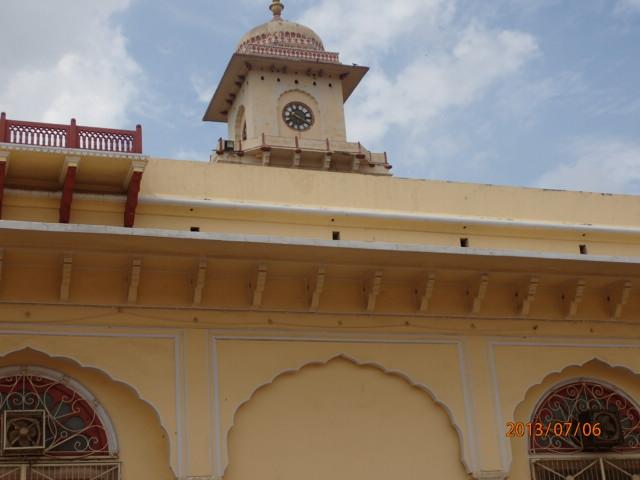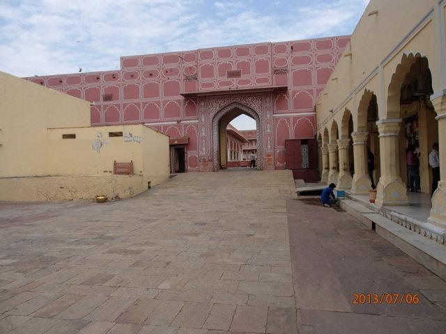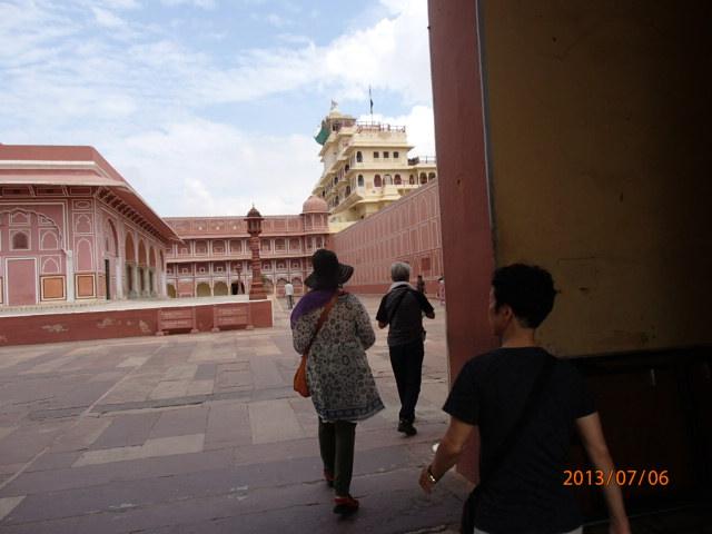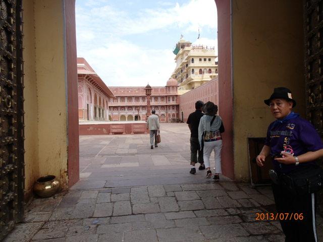 「水の宮殿」をバックに記念写真を撮り、バスは再び賑やかなジャイプール市内に入り、「風の宮殿」を左前方に見て、次の世界遺産「City Palace」正面入り口に横付けした。この「パレス」、宮殿には現在もマハラジャが住んでいて、日々の生活をしているとのことである。偶然、敷地内でマハラジャに遭えるかも知れない・・、と密かな期待を抱き、宮殿内に入って行った。