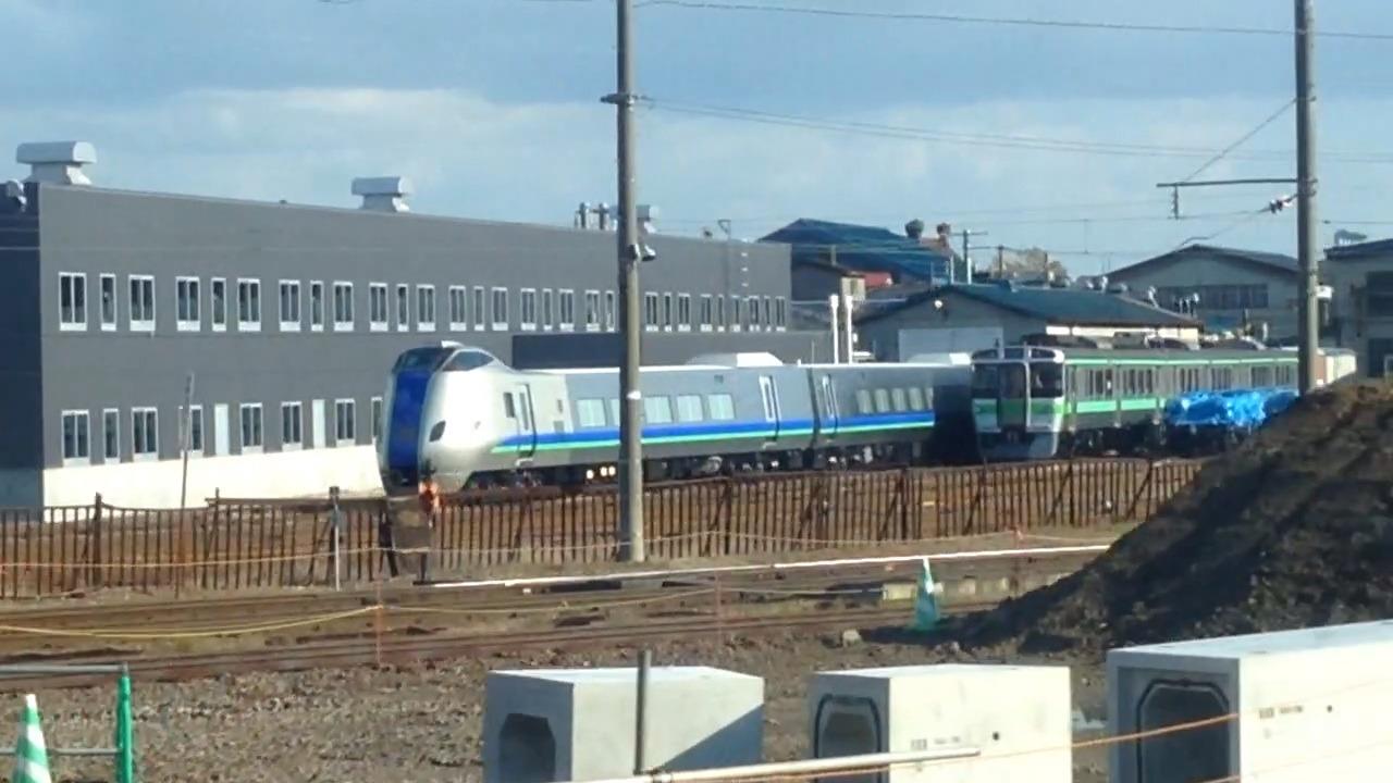 札幌を発車すると、車内放送が始まります。車内チャイムがアルプスの牧場でなく、森のくまさんのメロディが聞けます。苗穂通過のころツイッターでキハ285がいるとの情報があり、苗穂通過のときに撮影してみたらいました幻のキハ285系