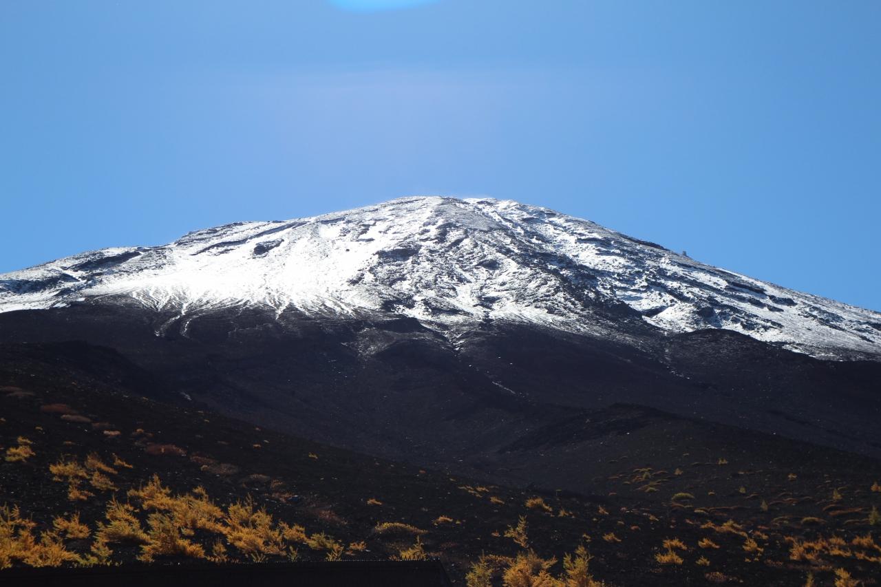 うっすら雪化粧した富士山が白く輝いています。
