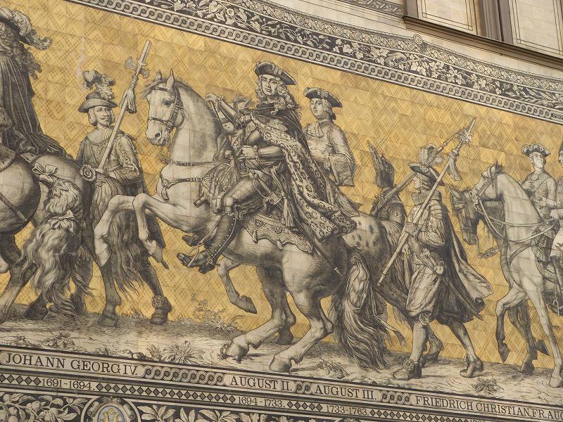 代々のザクセン君主を描いたドレスデン城外壁の「君主の行列」。19世紀にスグラフィート技法で描かれた壁画でしたが、痛みがひどくなり、1907年にマイセン製タイル2万5千枚で作り直されました。大空襲の時も奇跡的に無事だったそうな。