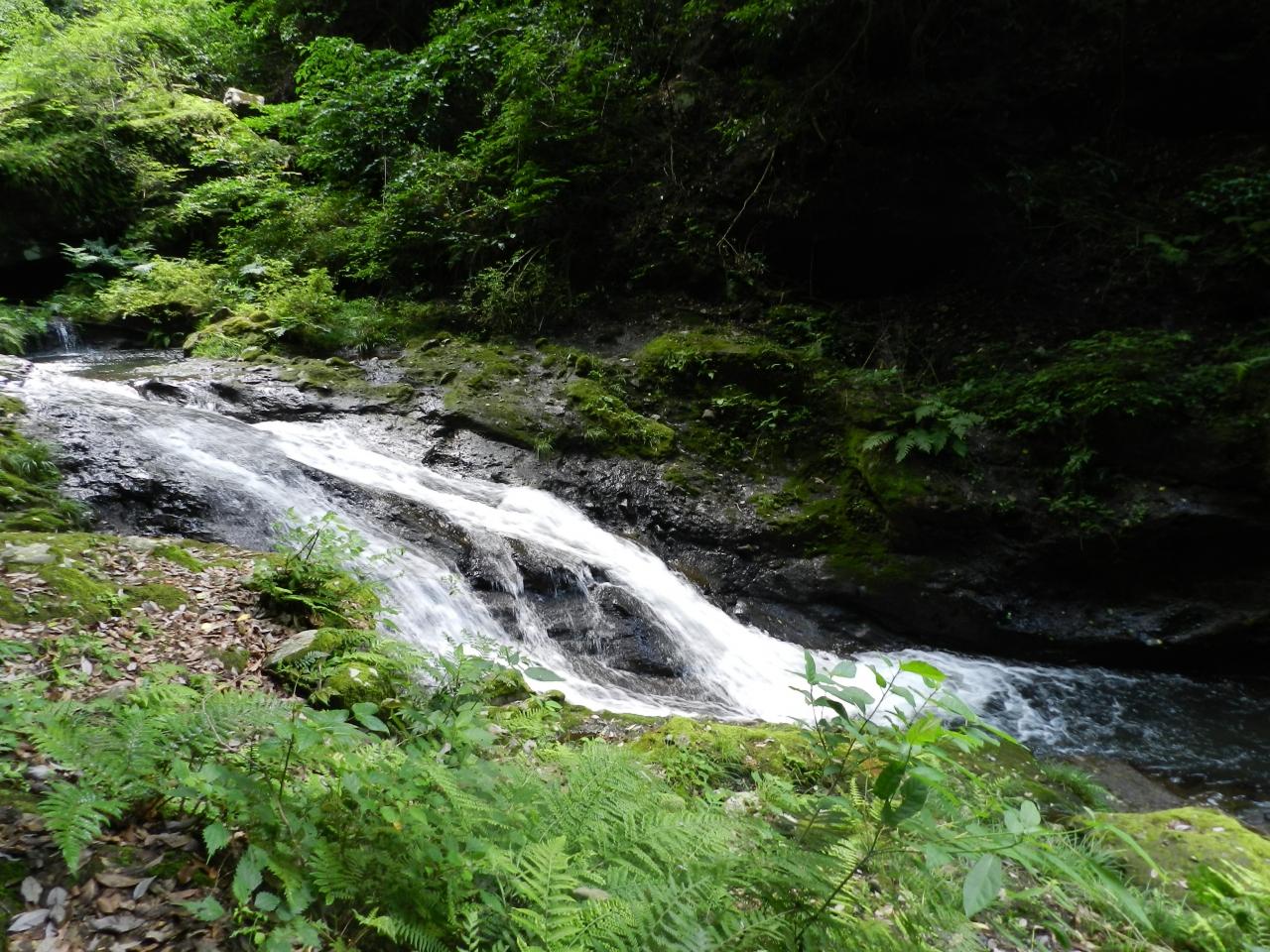 ナメ状の川床を滑るように流れる小滝が美しいです。