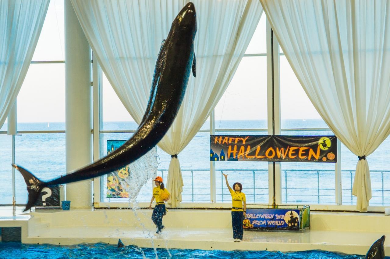 さて、最後はイルカショーの見学です。ハロウィンが近いということもあって、ハロウィンにちなんだ飾り付けなどもしていました。