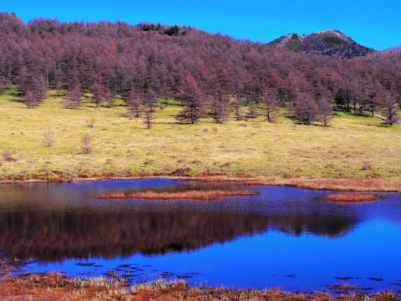 > 空気がすみ渡って、青空のきれいなこと。 雲海の向こうに見える富士山。そしてその名にふさわしく鏡池が周りの木々を映し出して、見事です。