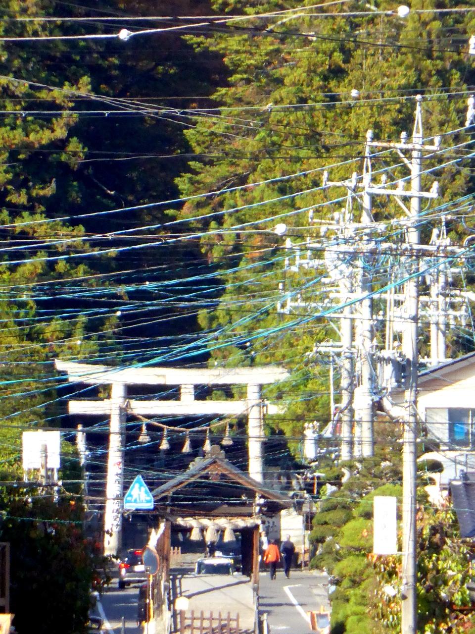 旧表参道の正面に鳥居が望めるようになると、その手前で道路の中央に注連縄を張った建物が鎮座しているのが見えてくる。