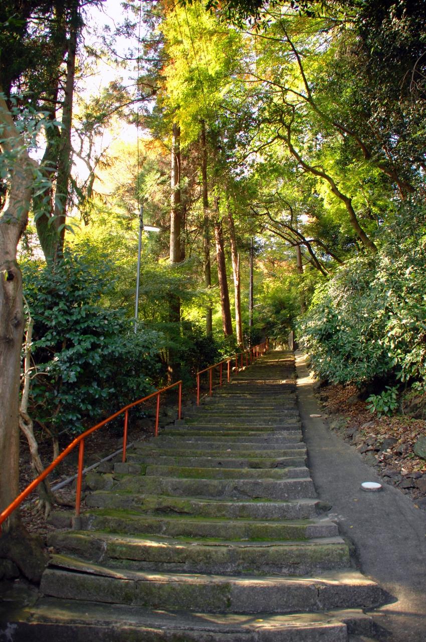 八幡駅前のスーパーがあり、そこの山手に有るので、急な参道の階段を駆け上がります。