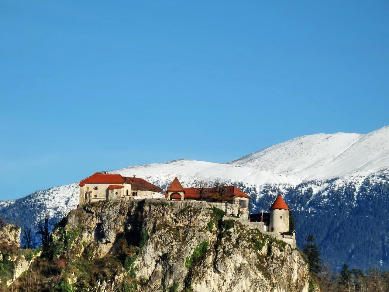 ブレッド城の後ろに見える山々は、ヨーロッパ・アルプスの東南端「ユリアン・アルプス」。 -