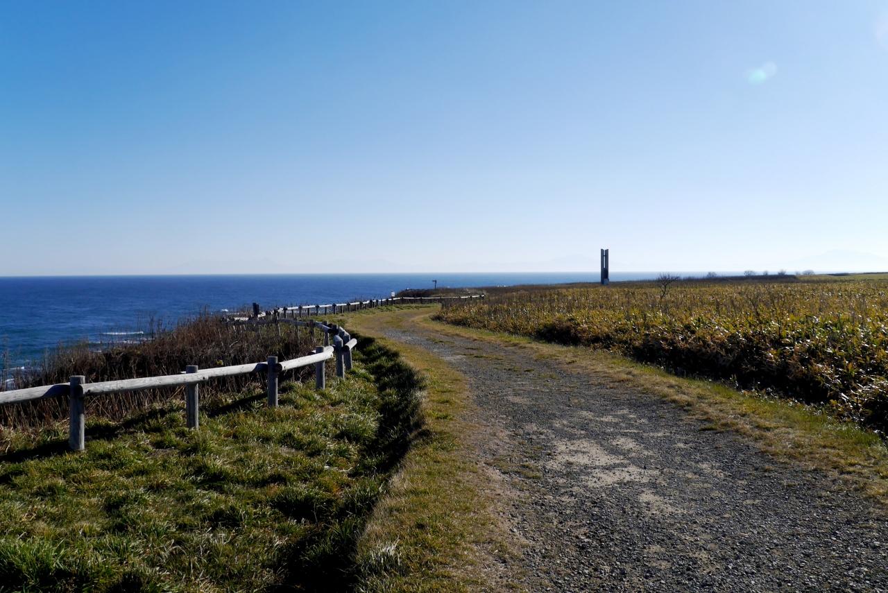0906能取岬.牧場のところから歩く.晴れて海がきれい.広大さが素晴らしい.うっすらだが知床の山並みもわかった.もうシーズンオフなのでほとんど観光客はいなかったが,季節風も減少し昨日までよりは暖かく素晴らしい景色を堪能した.