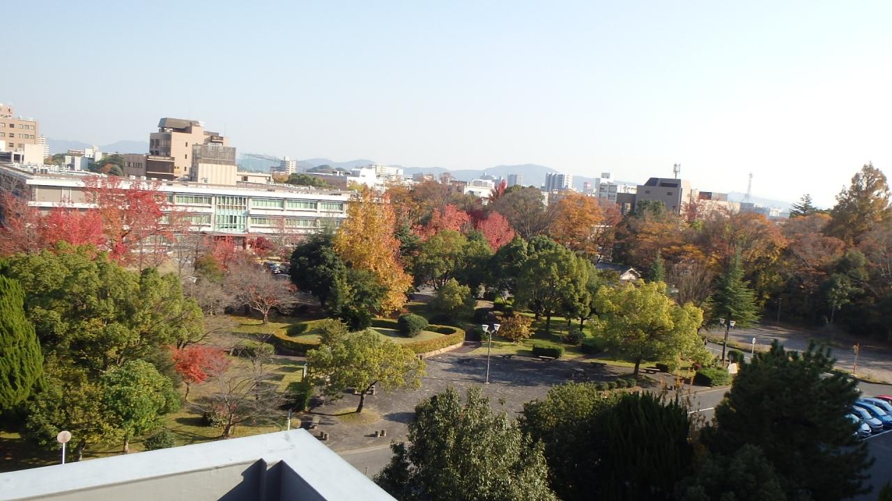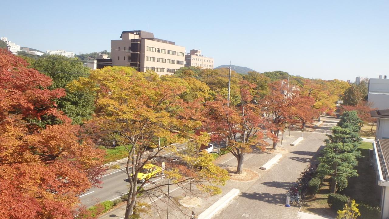11月22日。文学部5階から眺める岡大西門付近の紅葉。