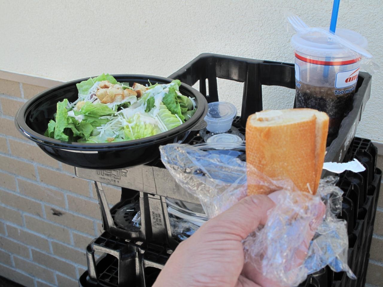こちらに来てから、あまり野菜を取っていなかったので、今日のランチは野菜サラダとサンドイッチパンとコーラ1リットル入りカップ。