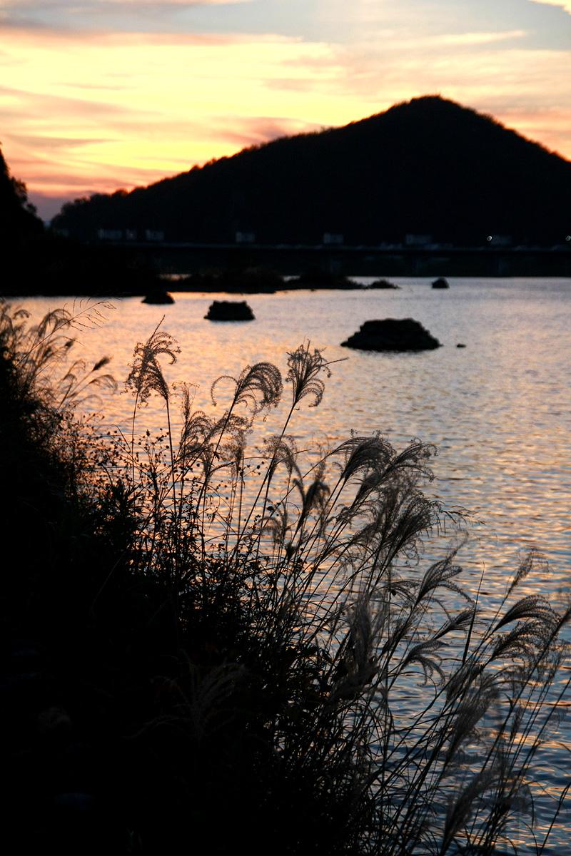 河岸にはすすきが・・・夕日と合わせて撮ってみました。