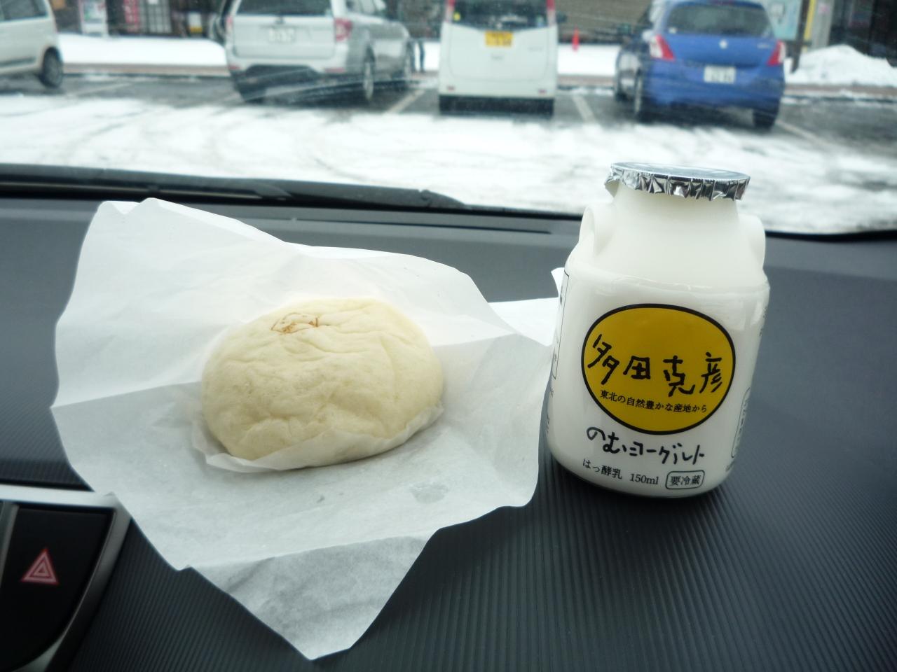 肉まんと飲むヨーグルトで腹ごしらえ。