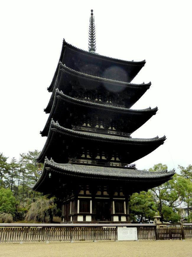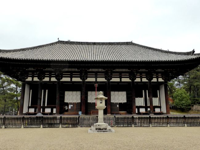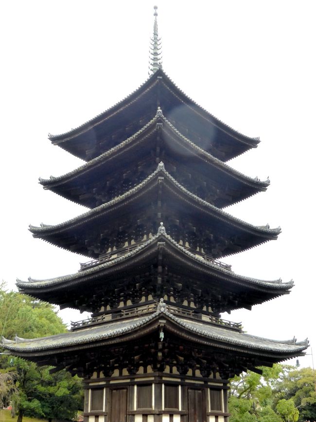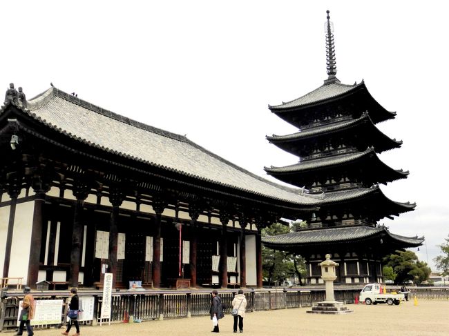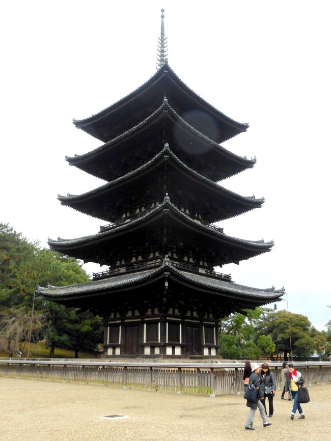 道路を隔てて南側は阿修羅のおわす興福寺国宝館が建ち、その更に南に鮮やかな姿の興福寺東金堂と国宝五重塔。