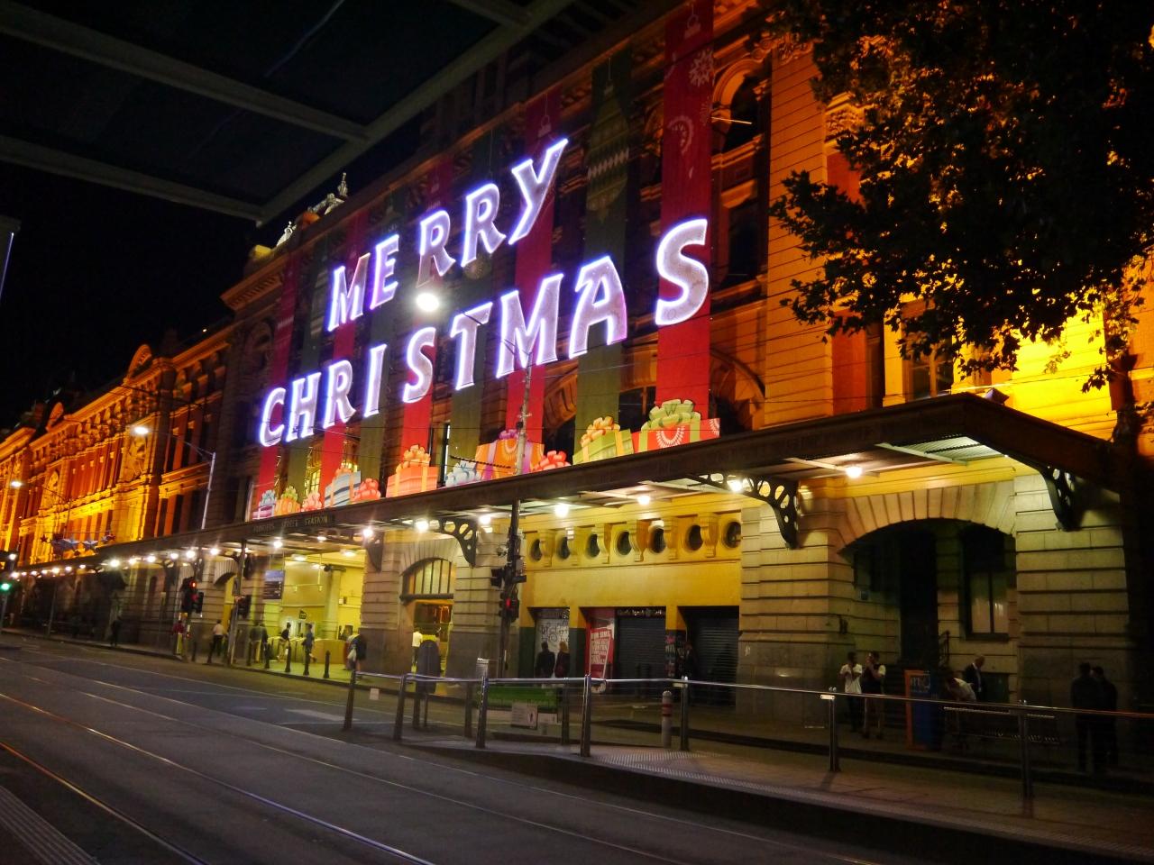 フリンダース駅のラッピングです。キリスト教国のクリスマスははじめて経験しますが、街中は賑わっています。