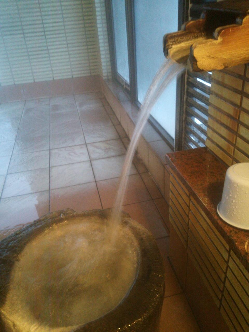 かけ流しの温泉が洗い場に出ています。シャワーや蛇口はなし。ダイナミックです。