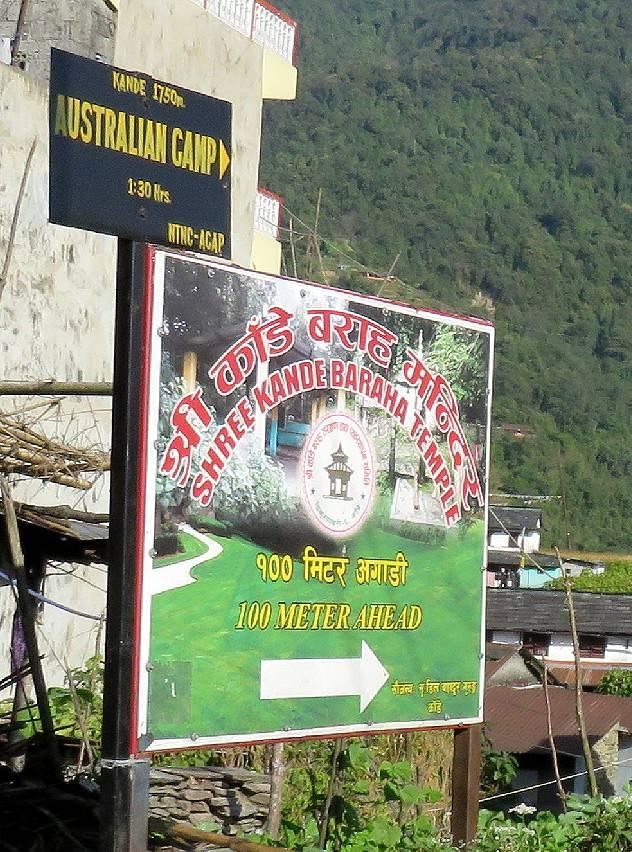 カーレ(Kande)に到着。タクシーはここまでで、明日の正午にフェディで落ち合うことにして、ラビさんと別れた。写真は、カーレの村の入口にあったオーストラリアンキャンプへの案内板。右に入るように書かれていて、所要時間は1時間半とある。案内板の通り右に入ると、そこは家々の間の路地のようなところで、そのあとの行き先の表示がない。しばらく行ってから左に曲がり、そのまま歩いていくと、また大通りに出てしまった。どうも道を間違えたかと思いながら歩いていくと、一人のおじさんが出てきて、盛んに手招きをしている。その人の後についていくと、たしかにトレイルと思われる道に出たので、もうこれで十分と話しても、なかなか帰らずにあとをついてきた。仕方がないので、100ルピーわたすと、そこでようやく分かれることができた。道に迷った人を見つけては、小遣いの足しにしているのかもしれない。