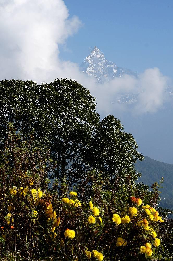 屋根からおりて、今度は庭から撮影したアンナプルナ。