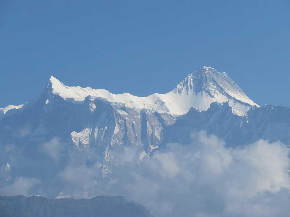 右のマチャプチャレを拡大。マチャプチャレとは魚の尾ひれという意味で、その名のとおり、頂上には尾ひれのような二つのピークがある。ポカラから見るとピークは一つしか見えないが、ここまで来ると、前のピークの後ろにもう一つのピークがわずかに見えていた。