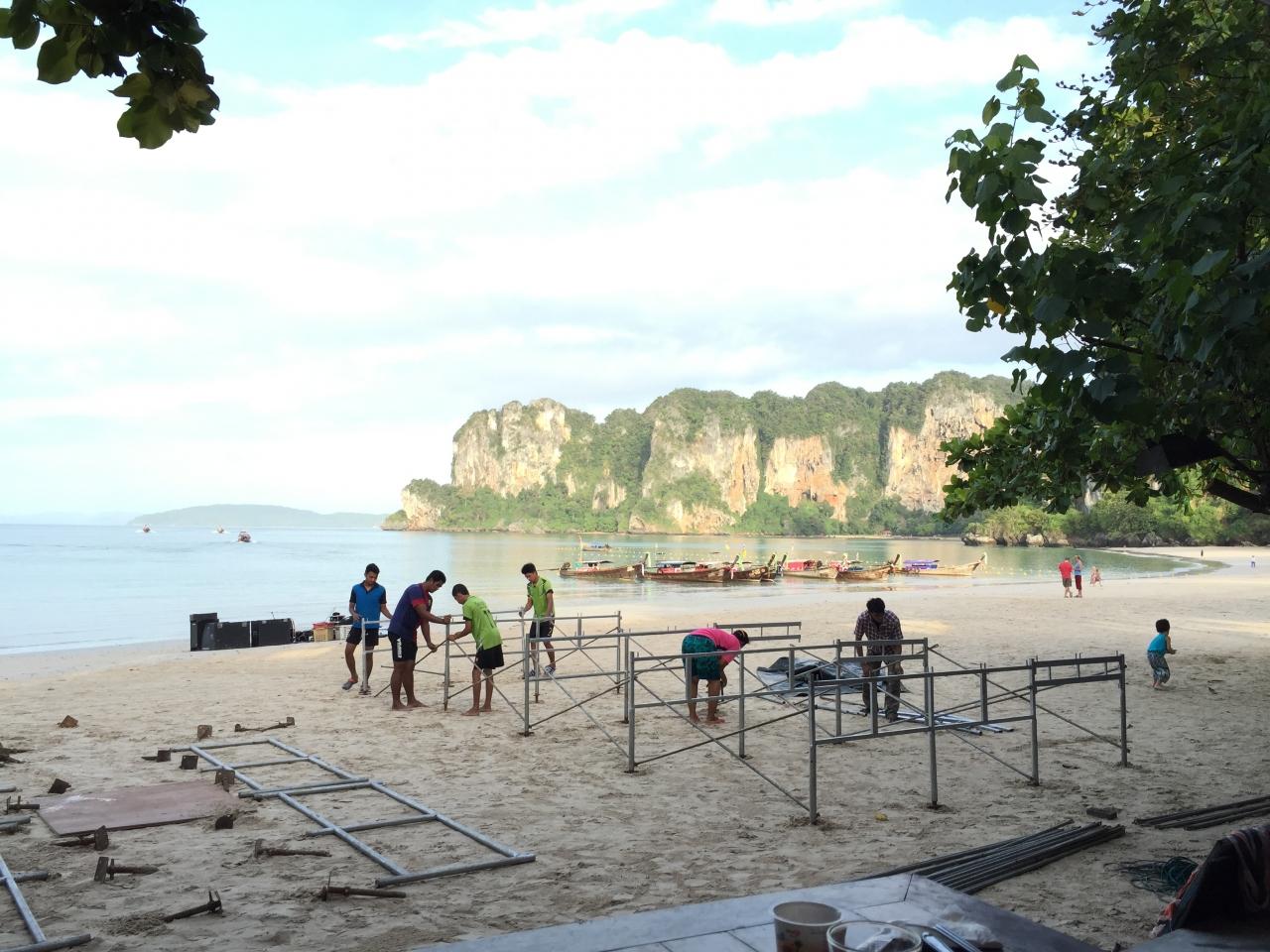 ホテル前のビーチでは、朝早くから明日のガラディナーのステージの準備が始まっていました。 -