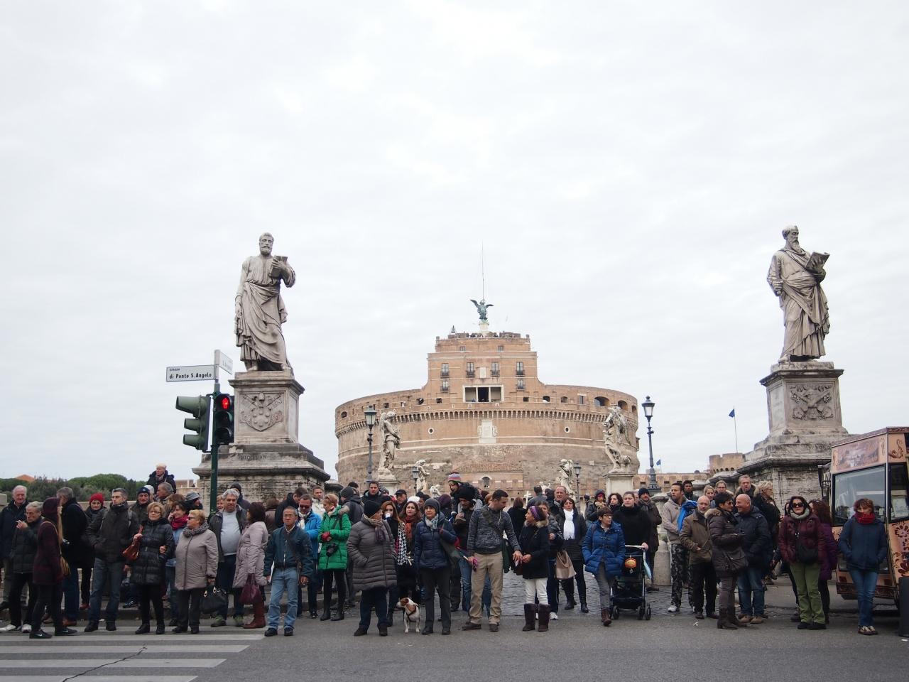 カンポ・デ・フィオーリ広場からまたまた徒歩で、今度はサンタンジェロ城やサン・ピエトロ大聖堂を目指しました。今回同行者の1人が一番行きたかったのが、サン・ピエトロ大聖堂。ところがクリスマスシーズンだからか、ものすごい行列が広場や回廊を取り巻き、どこが最後尾なのか、どれがシスティーナ礼拝堂へ行く行列で、どれがサン・ピエトロ大聖堂直行なのかもよく解らない。個人旅行の悲しさです。行列に並んでいる人に聞けば良かったのですが、誰もそんな勇気もなく、サン・ピエトロ広場からスペイン広場に向かいました。