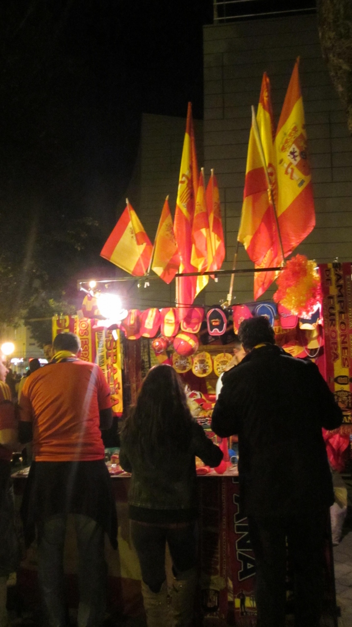 露店が何個かあり、スペイン代表のマフラーやユニフォームなどが売ってました。オフィシャルグッズではないためエンブレムはついてなかったです。 -