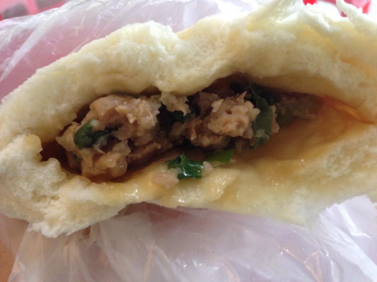 できたての包子を半分に割るとふわふわ過ぎてぺっちゃんこになってしまいましたが、お肉がジューシーでおいしい〜!