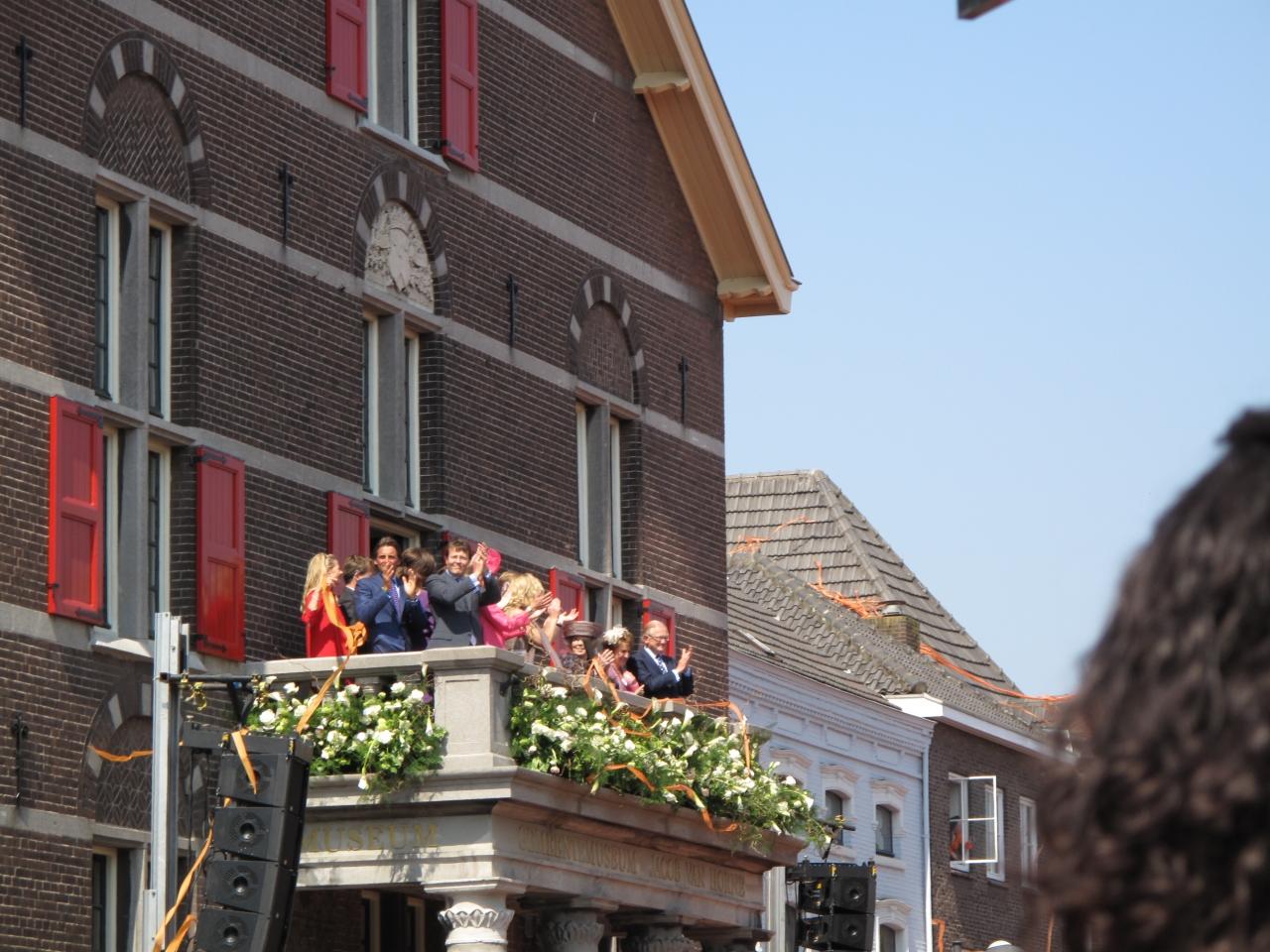 パレードが通過した為に、Weert市庁舎に戻りました。パレードを完了した王族が2階のベランダにあがり、姿を現されました。女王様やマキシマ皇太子妃(当時)が目立ちます。12:28です。