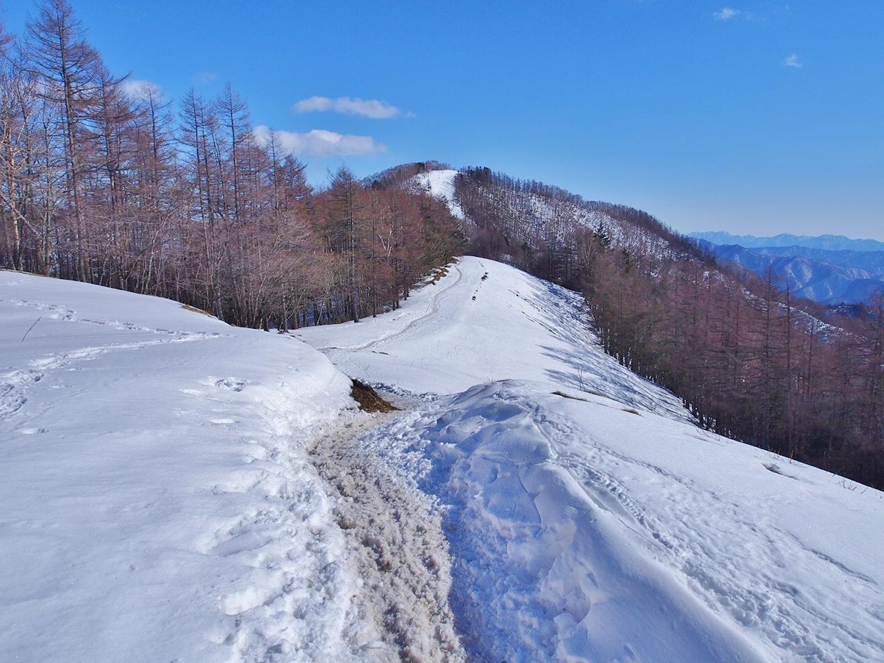 いよいよ稜線。陽のあたる場所は雪が融けて登山道ヌチャヌチャ。