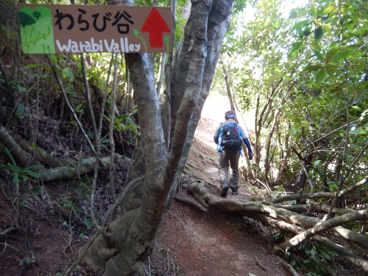 森に入る前に靴底の泥を落としてから山道に入りました、道沿いにあるお花や、周辺の山々を見て、常世の滝周辺からジャングルの中を歩きました、途中に戦争時に使われたトラックの残骸を見たり、猫の捕獲装置を見たりしながら千尋岩まで歩きました。