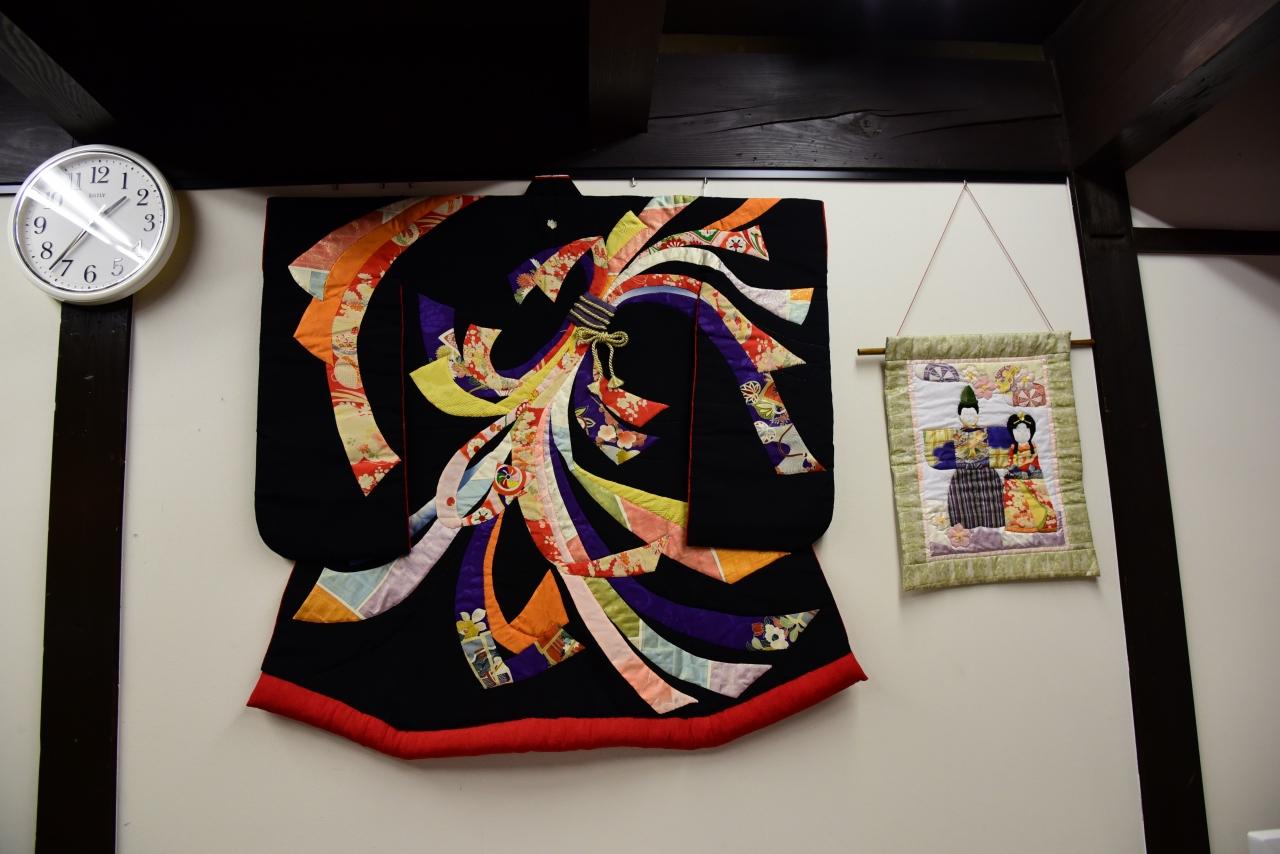 「束ね熨斗」模様が鮮やかな、子供用の着物も飾られています。