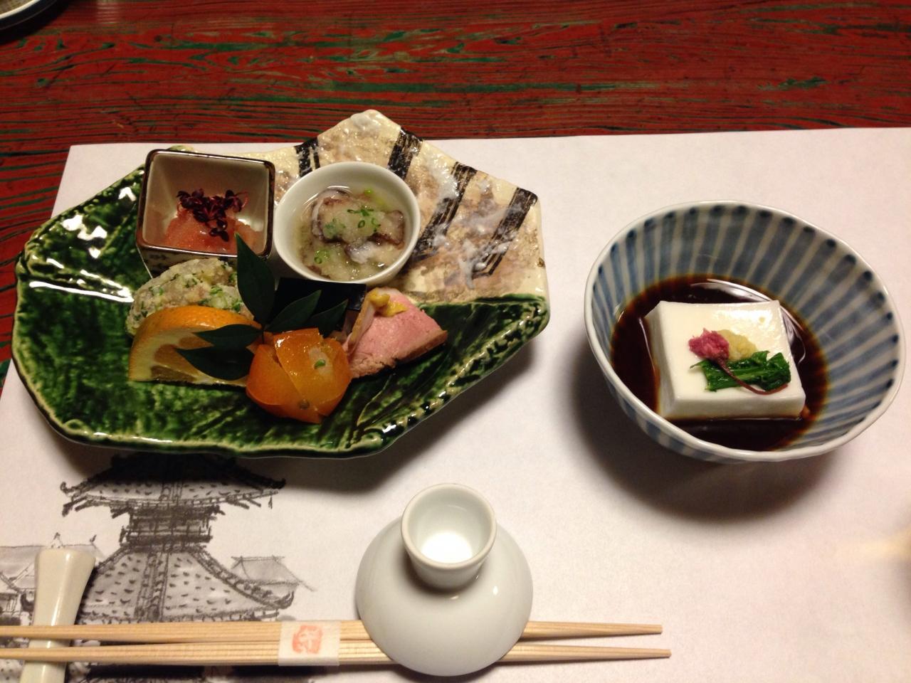 まずは、臼杵の郷土料理“きらすまめし”などの前菜と胡麻豆腐です。“きらすなめし”とは、お魚と“おから”を混ぜてあるそうで、お好みでカボズ搾っていただきます。胡麻豆腐も美味しい〜